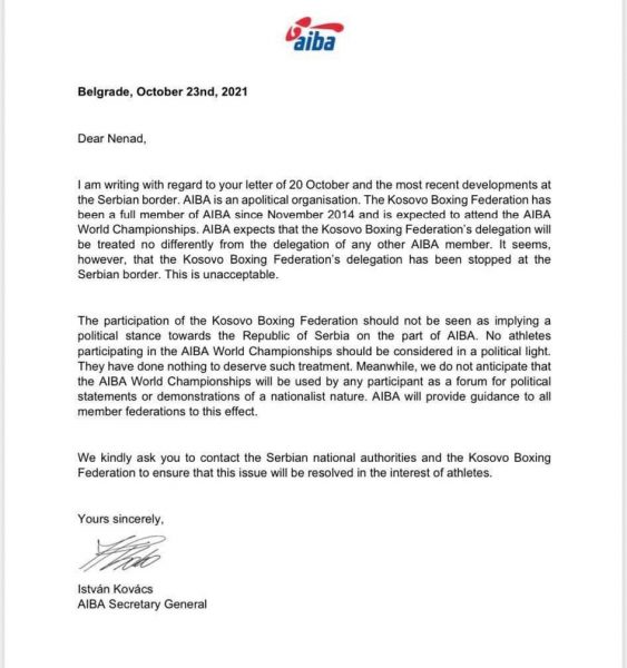 Sekretari i përgjithshëm i AIBA-s, Istvan Kovacs, në një letër drejtuar Federatës Serbe të Boksit, e ka konsideruar të papranueshëm vendimin e Serbisë që të mos ua lejojë hyrjen në territor të saj boksierëve nga Kosova për pjesëmarrje në Botërorin e Boksit.